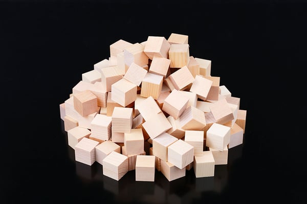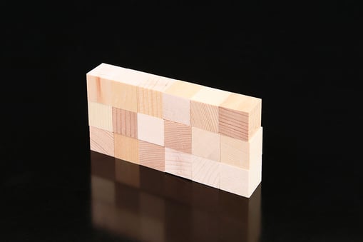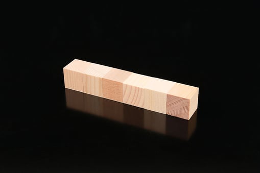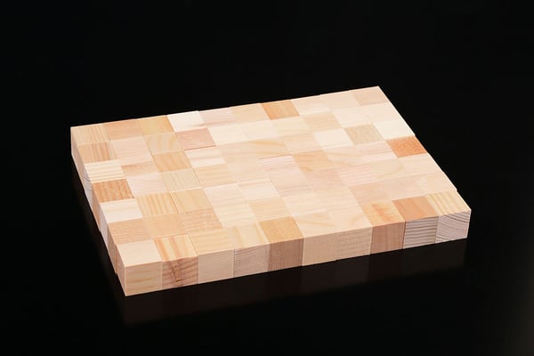 桧を25mm×25mm×25mmのワンサイズに加工した木製のブロック。桧は我が国の代表的樹木の一つで、木部の柔らかい部位(春材)と硬い部位(秋材)との差が小さくカンナをかけると平滑で艶のある表面が得られます。
